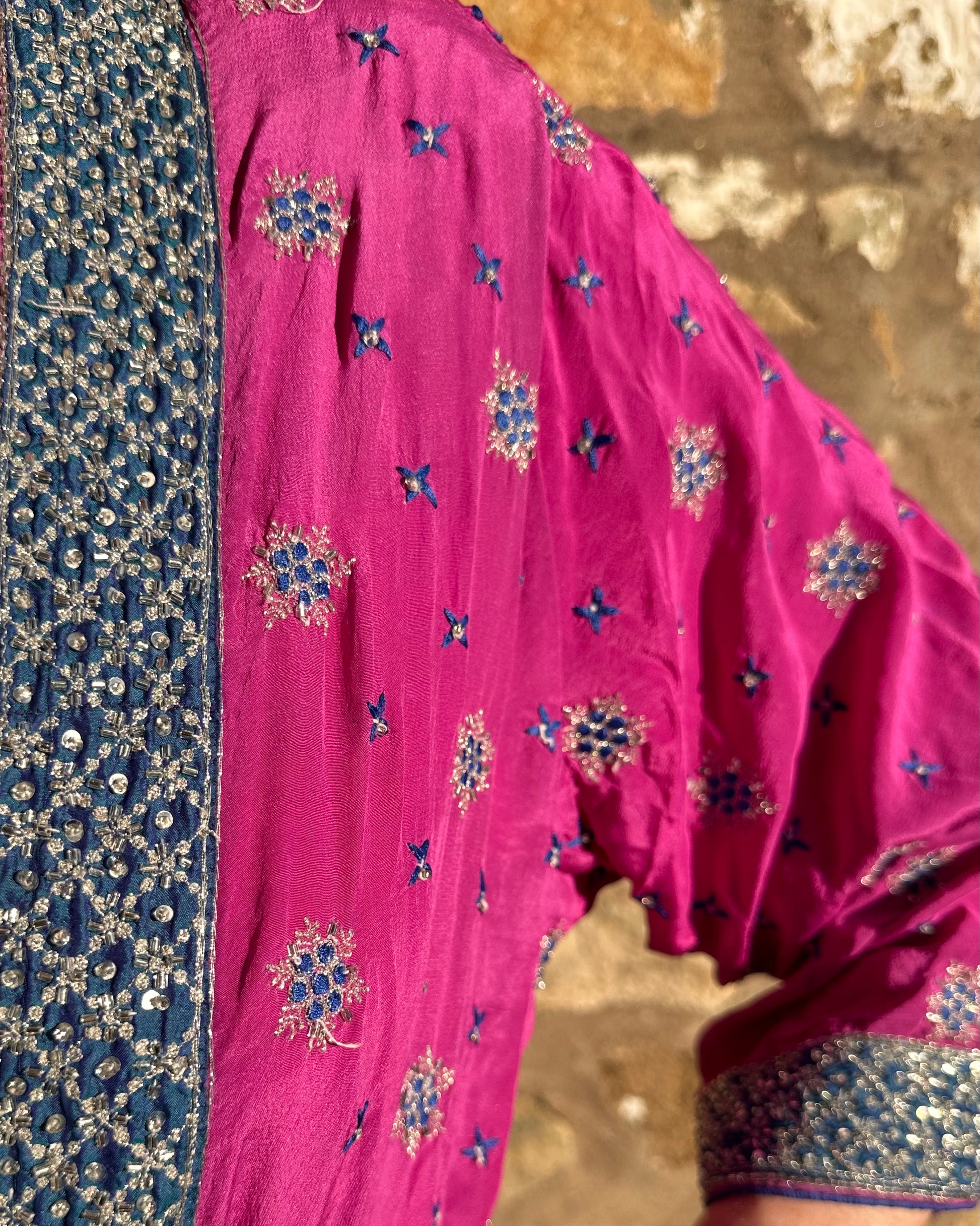 Introducing Briony - Silky Purple with Blue bead Kimono! Made with luxurious silky fabric and adorned with intricate blue and silver beading, this kimono will surely stun the crowd. Be the center of attention with this decadent overlayer.