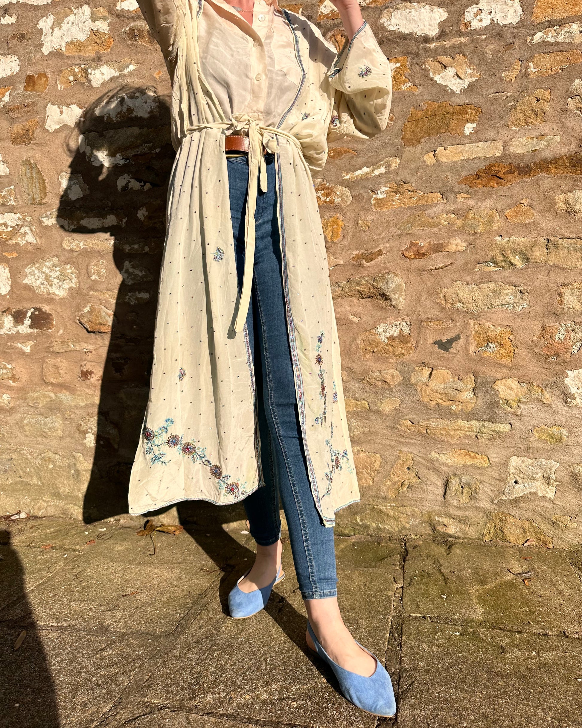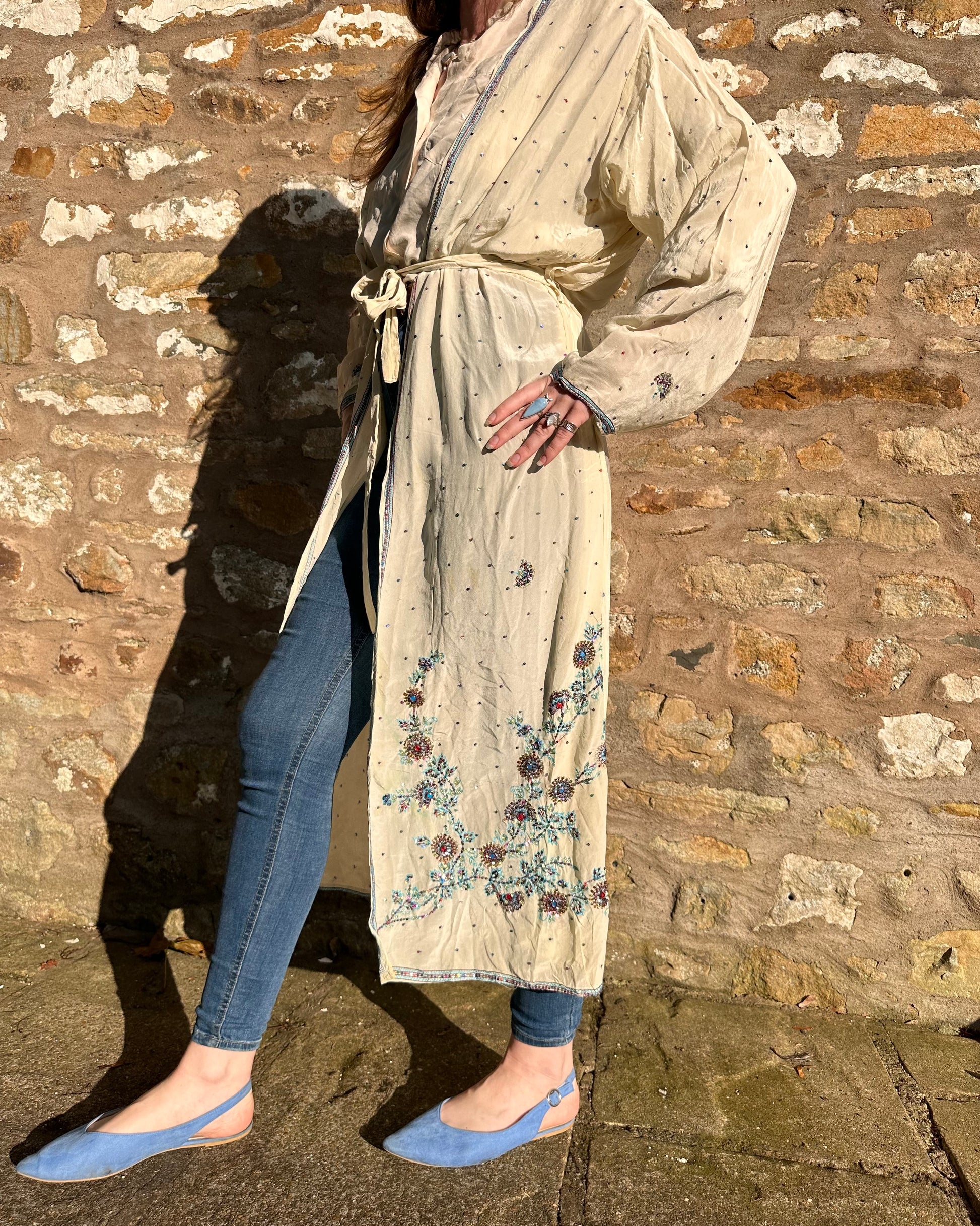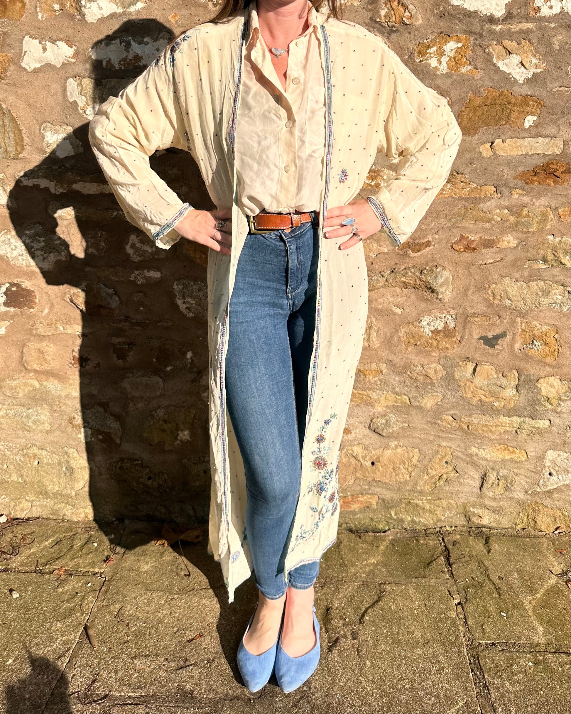 Up the anti in your wardrobe with Lyra, our ethereal kimono featuring delicate blue beadwork on a creamy, silky fabric. Perfect for layering over jeans, this statement piece effortlessly transitions from day to night, adding a touch of sophisticated charm to any look.