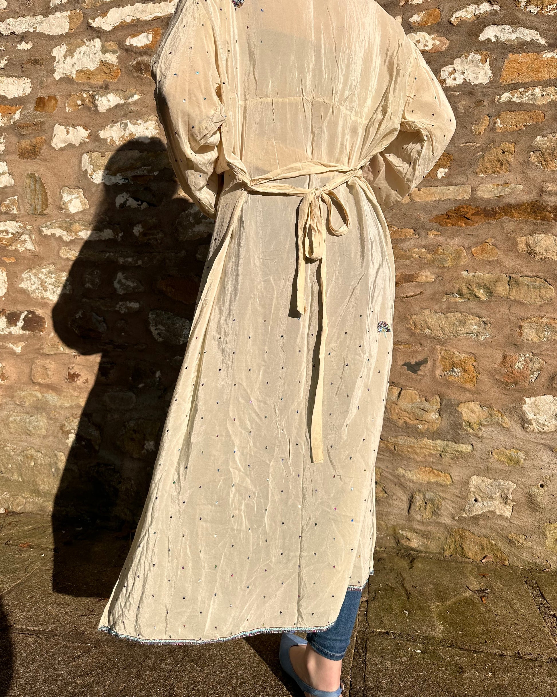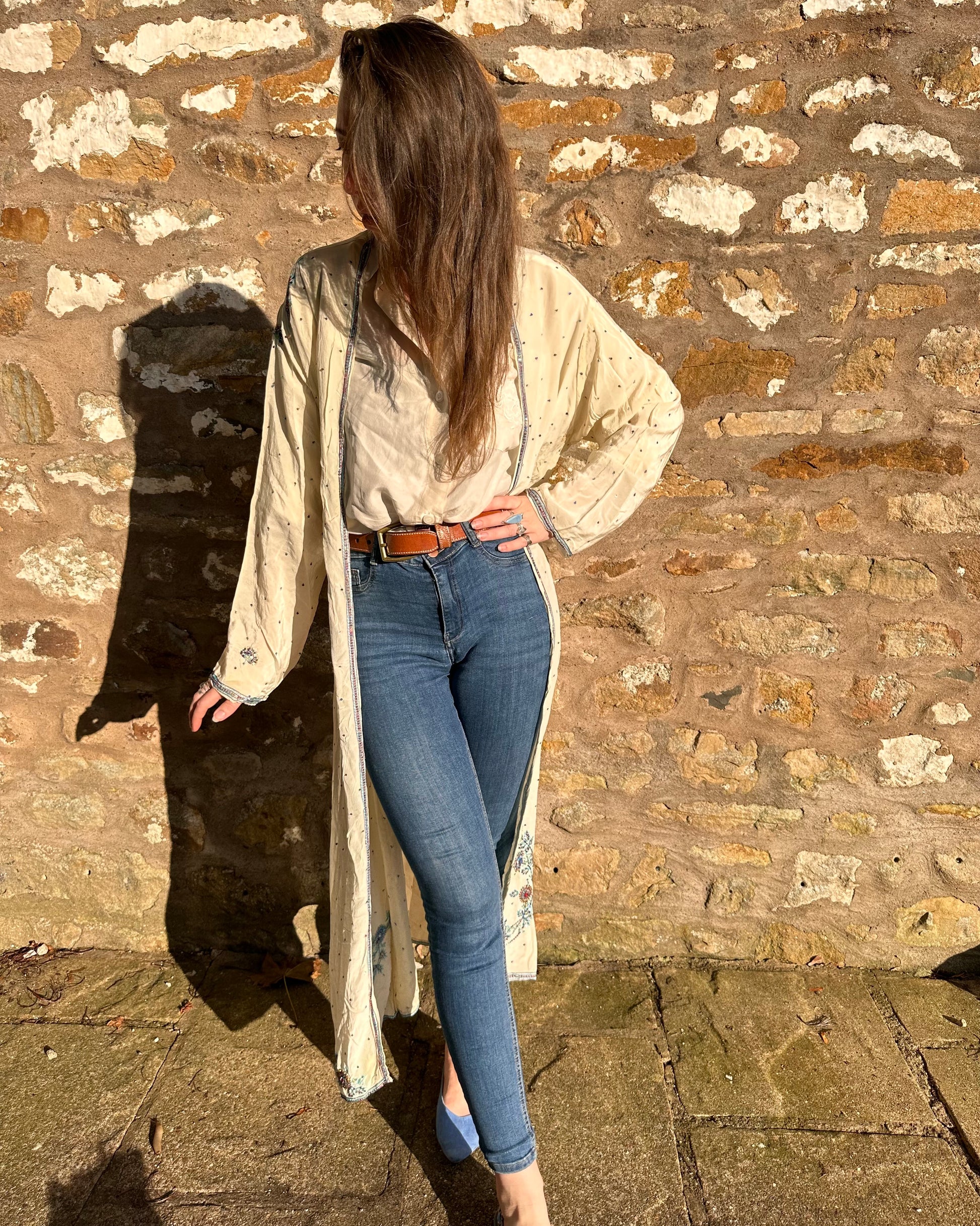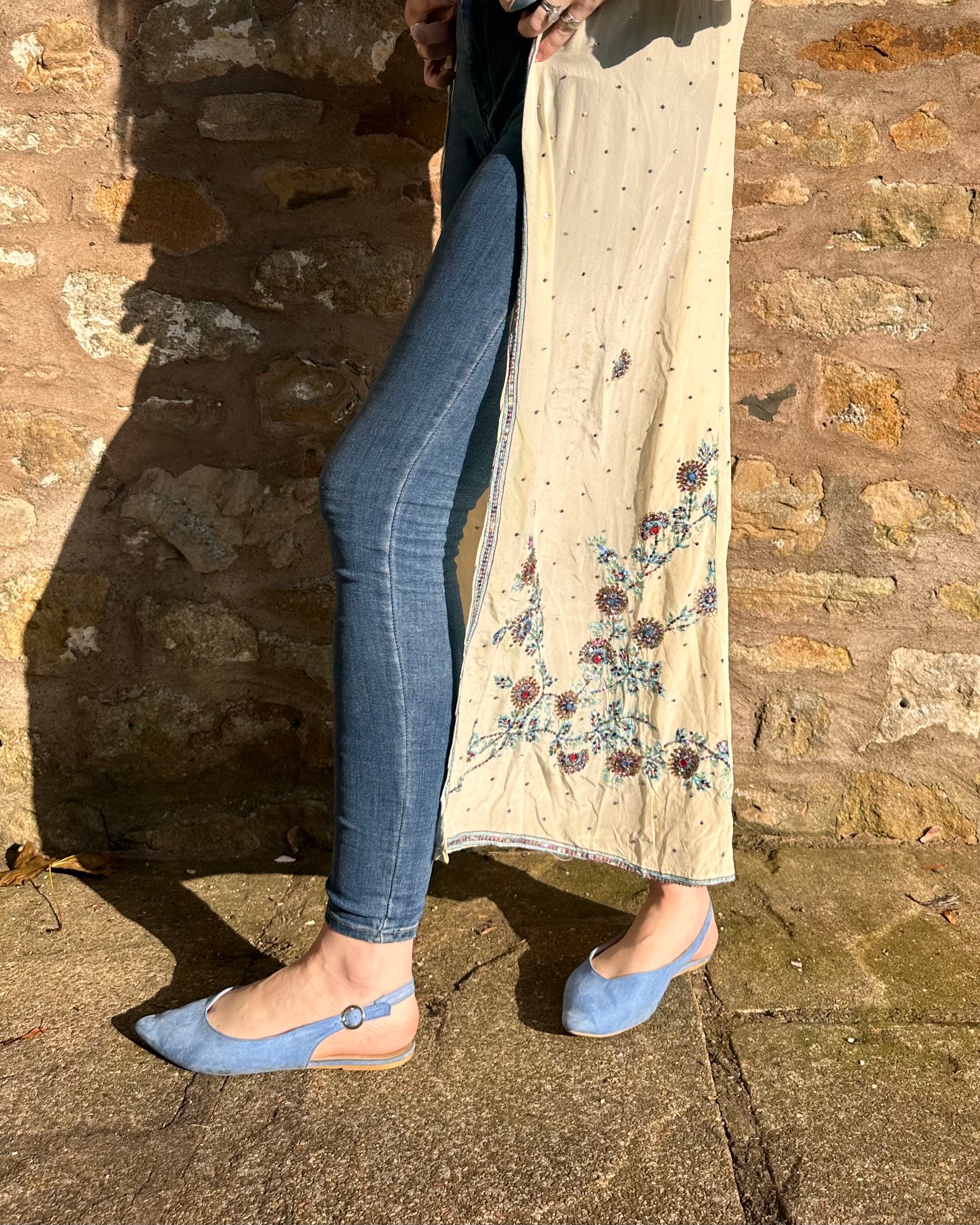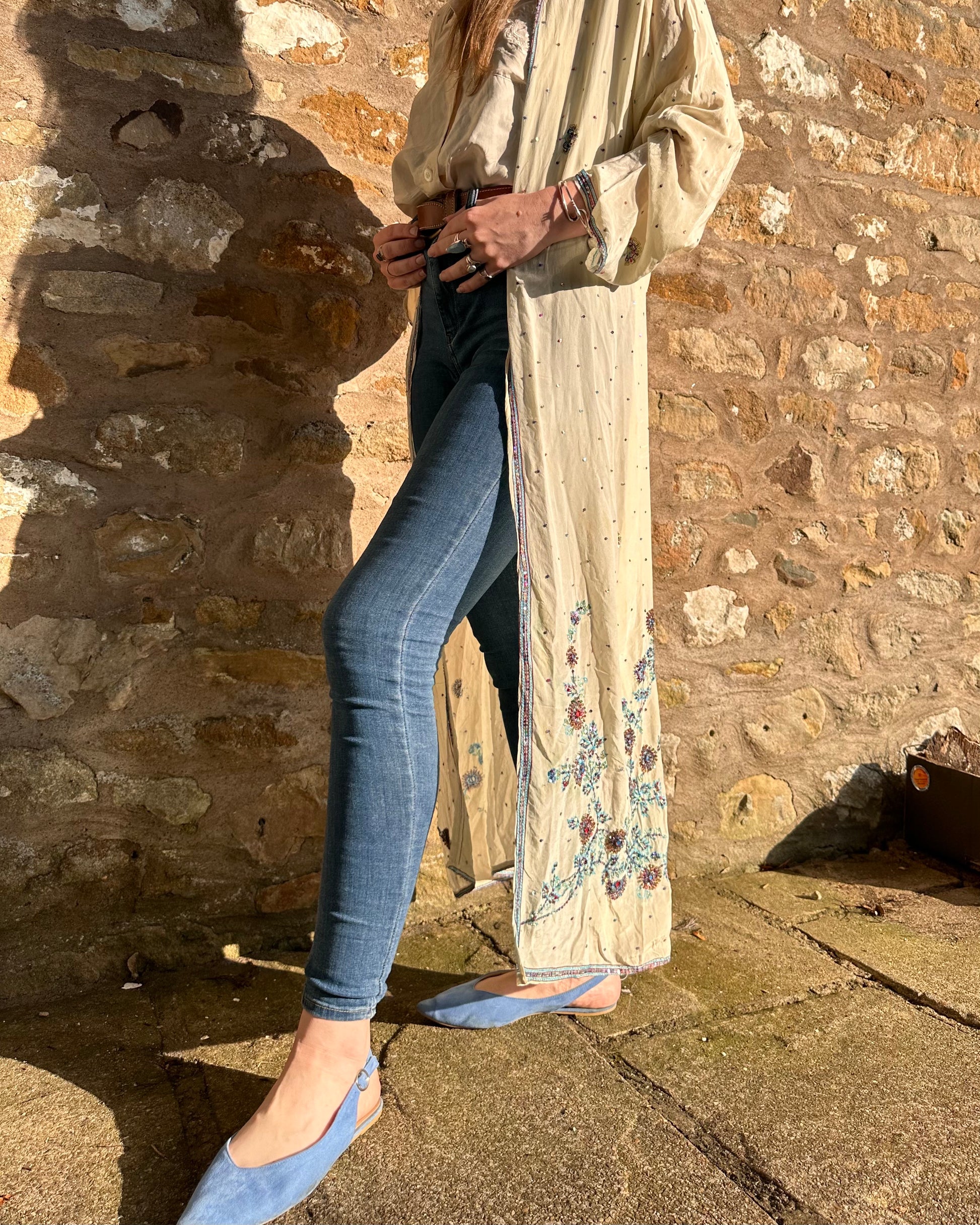 Up the anti in your wardrobe with Lyra, our ethereal kimono featuring delicate blue beadwork on a creamy, silky fabric. Perfect for layering over jeans, this statement piece effortlessly transitions from day to night, adding a touch of sophisticated charm to any look.