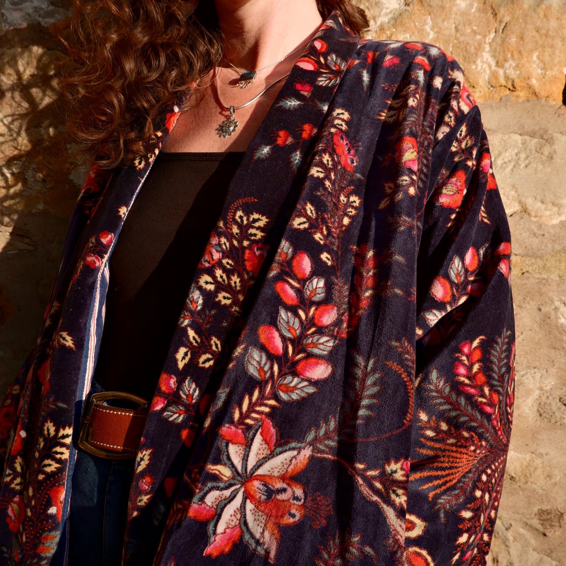In deep navy this popular colour is both classy and Bold with bright pops of colour. With the beautiful pattern of birds of paradise and decadent flowers. Add this over a white top and jeans or pair with a block of colour - a dress or jumpsuit or even a simple LBD. A piece that is sure to wow!