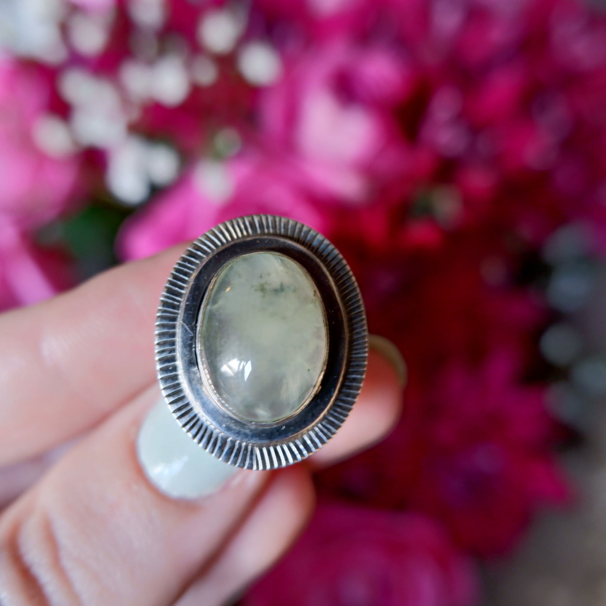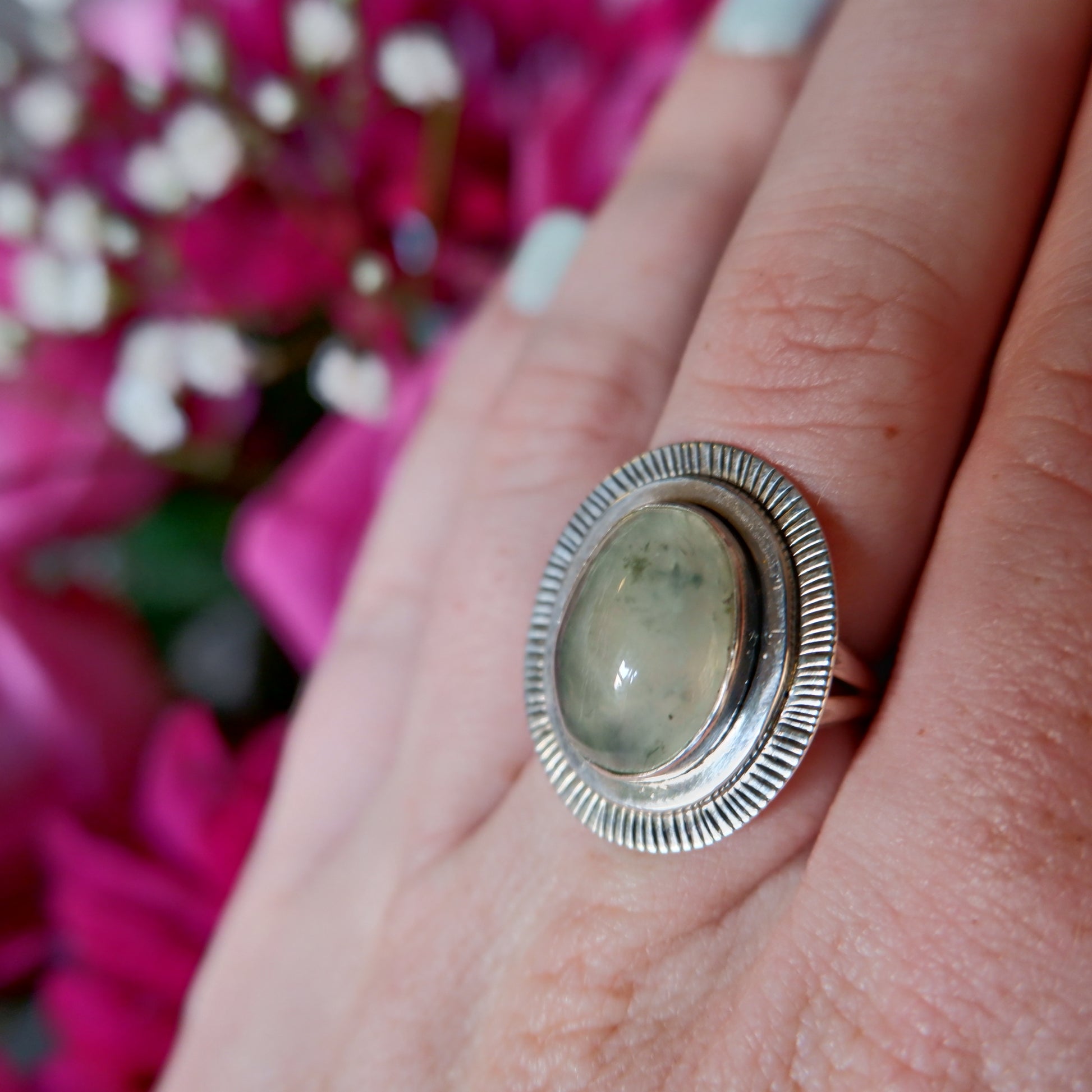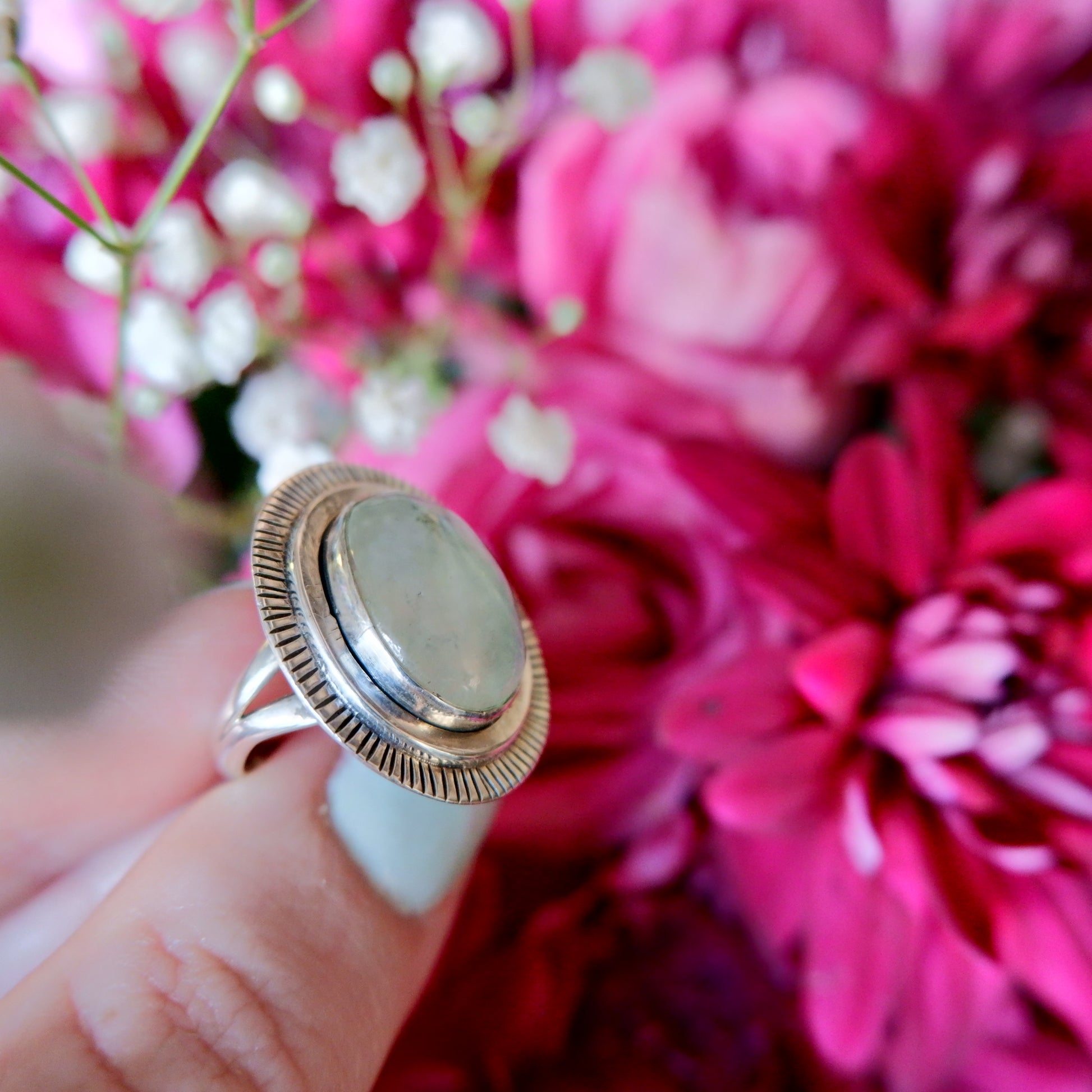 This striking ring half’s an impressive oval of Prehnite, framed by a beautiful of Sterling Sikver etched to shine like the sun around this earthy stone of love. Be sure to wow admirers with this unique piece in the Ethereal Collection.