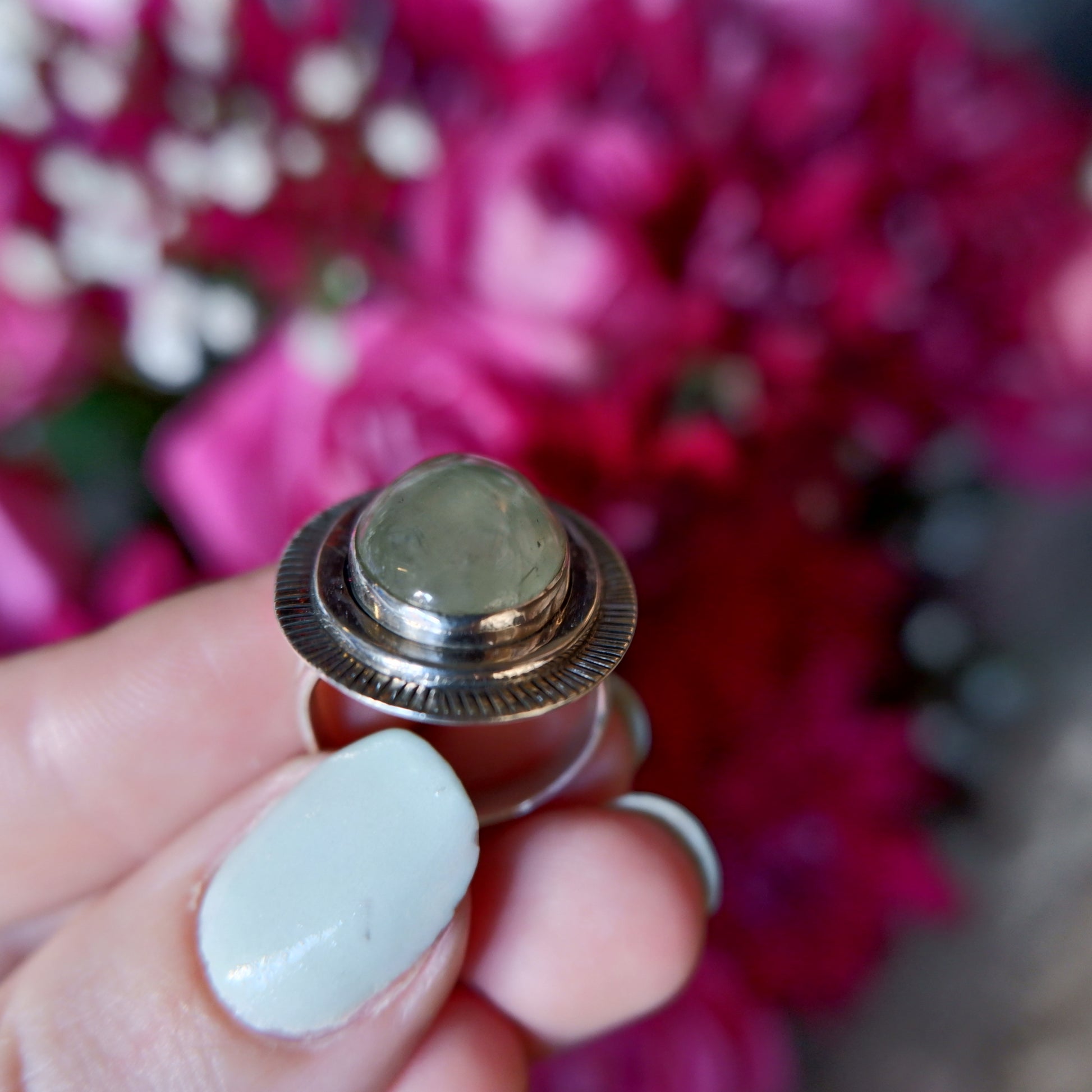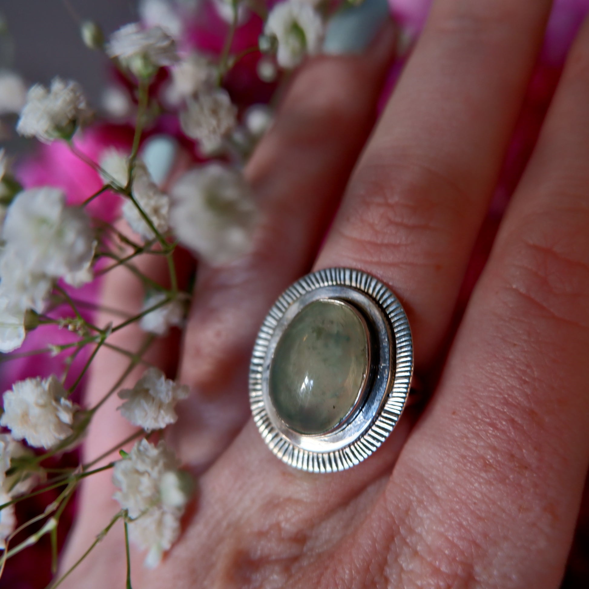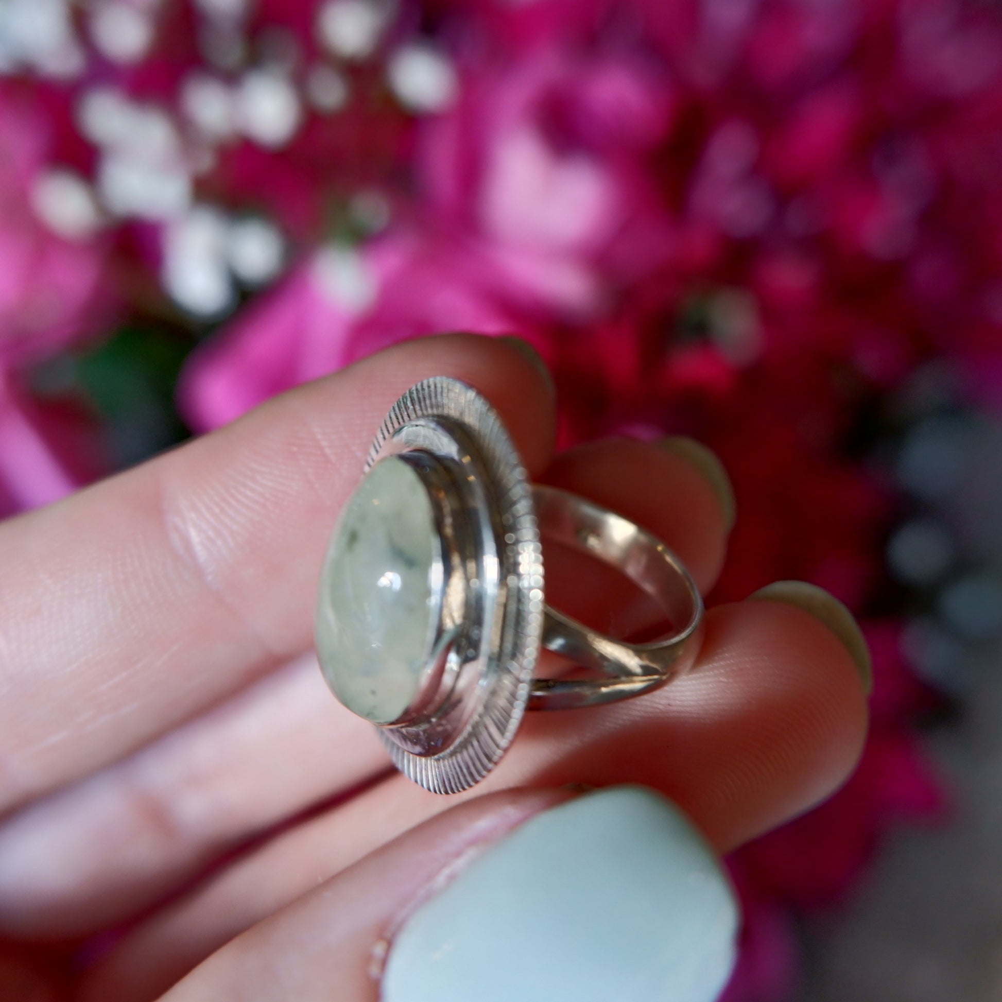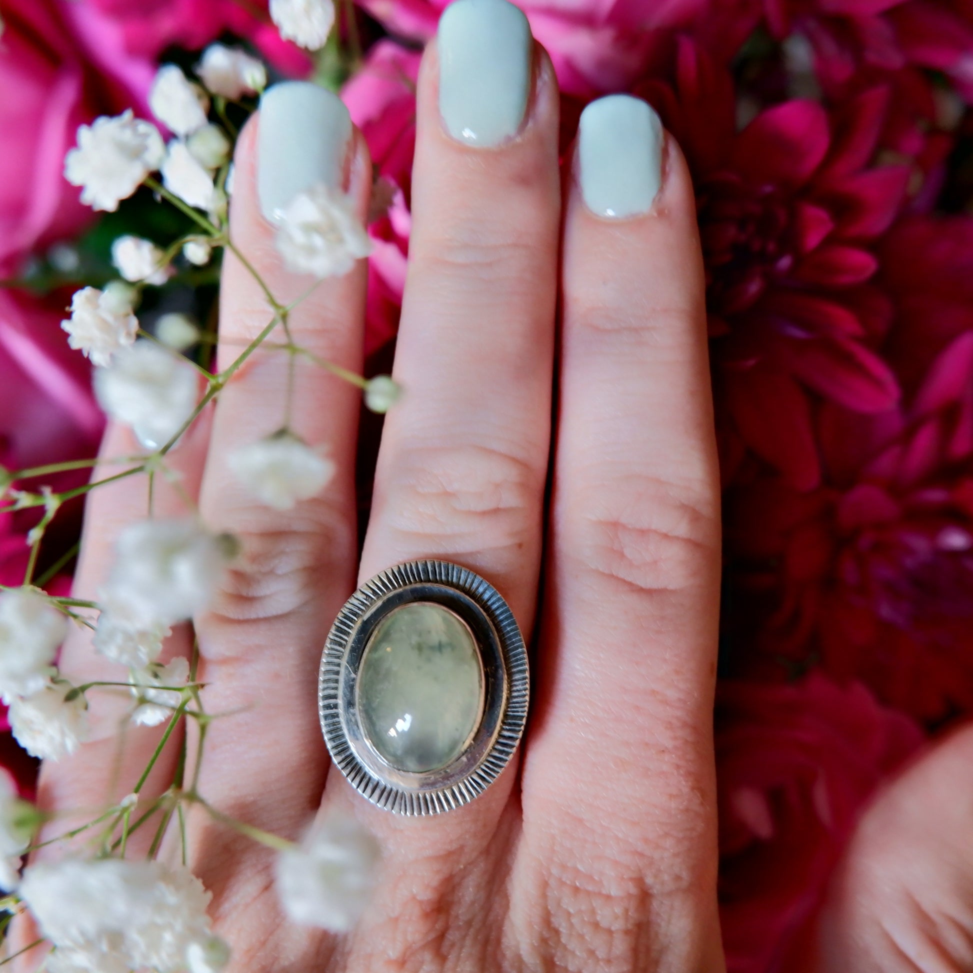 This striking ring half’s an impressive oval of Prehnite, framed by a beautiful of Sterling Sikver etched to shine like the sun around this earthy stone of love. Be sure to wow admirers with this unique piece in the Ethereal Collection.