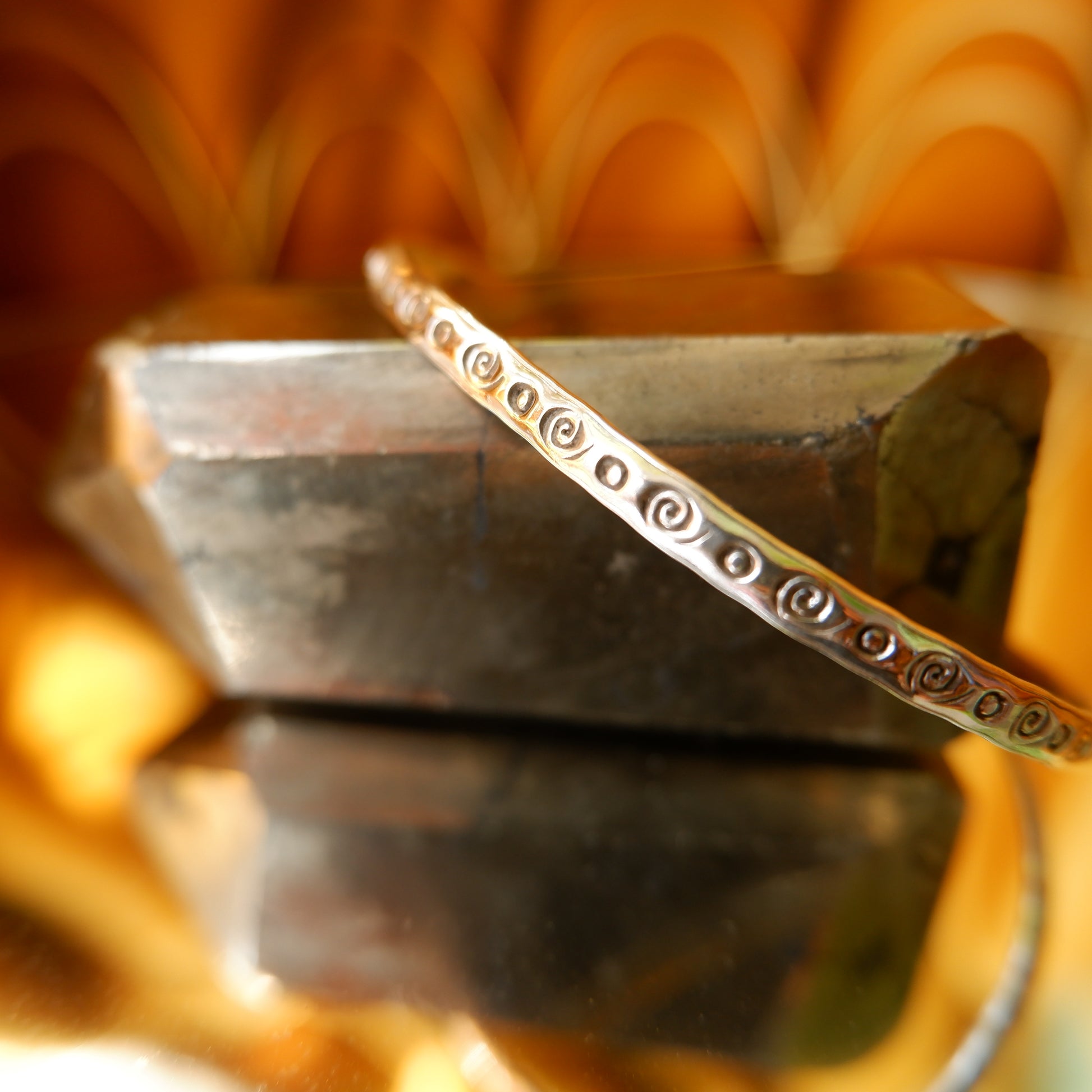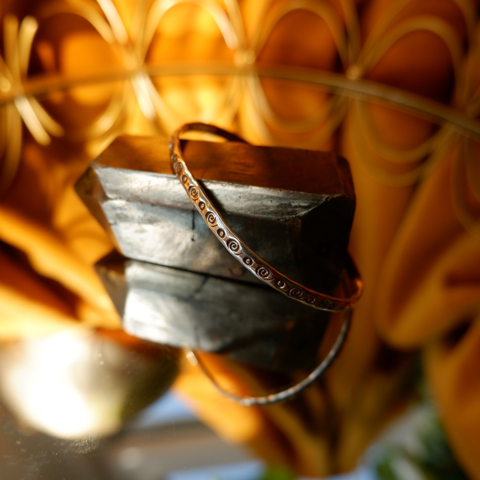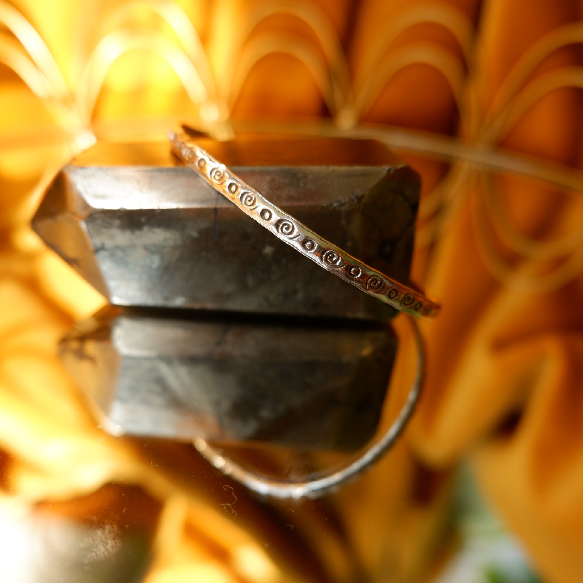 Elevate your style and add a touch of elegance with our Sarah silver bangle. This simple and classic bangle is adjustable to fit any wrist size and features a stamped swirl design, adding a unique charm to any outfit. Perfect for everyday wear or a special occasion, make a statement with the Sarah bangle!